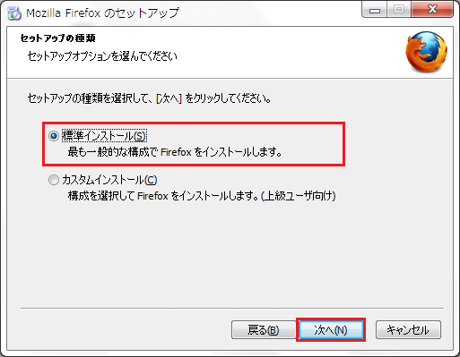 ■ 「セットアップの種類」画面が表示されましたら、「標準インストール(S)」を選択し、「次へ(N)」ボタンをクリックします。