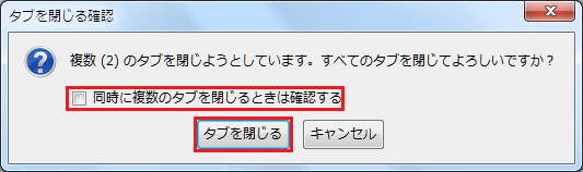 ■ 以下の画面が表示されましたら、「同時に複数のタブを閉じるときは確認する」にチェックを外し、「タブを閉じる」ボタンをクリックします。 ・「同時に複数のタブを閉じるときは確認する」にチェックを外す。