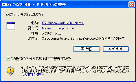 ■ 「開いているファイル - セキュリティの警告」画面が表示されましたら、「実行(R)」ボタンをクリックします。