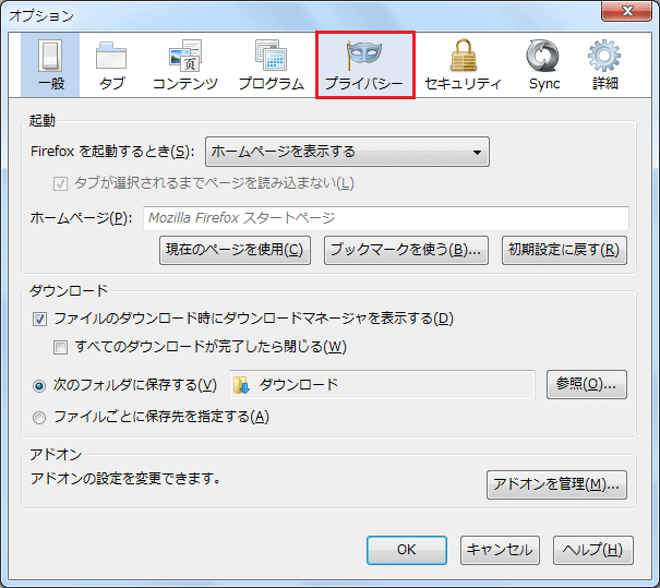 ■ 「オプション」画面が表示されましたら、「プライバシー」項目をクリックします。