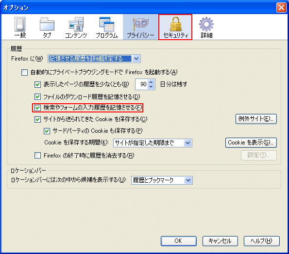 ■ 以下の画面が表示されましたら、「検索やフォームの入力履歴を記憶させる(F)」にチェックし、「セキュリティ」項目をクリックします。