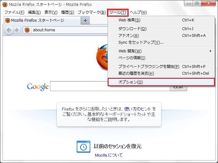 ■ 「Firefox」が起動しましたら、メニューバーの「ツール(T)」より「オプション(O)」をクリックします。