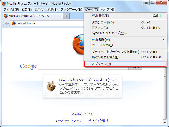 ■ 「Firefox」が起動しましたら、メニューバーの「ツール(T)」より「オプション(O)」をクリックします。