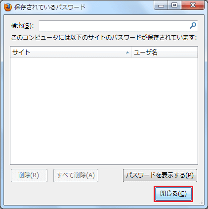 ■ 「保存されているパスワード」画面が表示されましたら、「すべて削除(A)」ボタンをクリックします。 ※上記操作方法は「パスワード」が複数登録されている場合、すべて削除されますので注意願います。