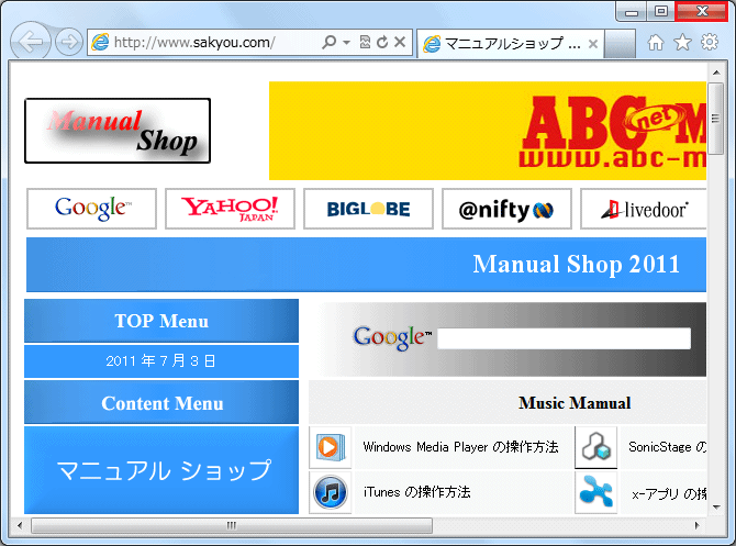 ■ 「Internet Explorer」の画面に戻りましたら、 「 閉じる(×)」ボタンをクリックします。