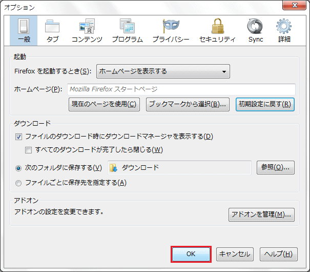 ■ 「オプション」の画面が表示されましたら、「一般」項目の設定を確認し、「初期設定に戻す(R)」ボタンをクリックします。 ・「起動」枠内の設定 ・ 「Firefox を起動するとき(S):」の「▼」ボタンをクリックし、「ホームページを表示する」を選択します。
