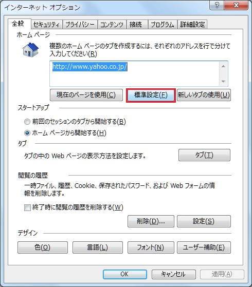 ■ 「インターネット オプション」の画面が表示されましたら、「ホーム ページ」項目の「標準設定(F)」ボタンをクリックします。