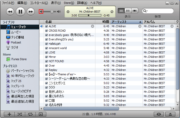 ■ 「音量最小化/ミュート」ボタン。再生中の音楽の「音」を出力させなくする機能です。